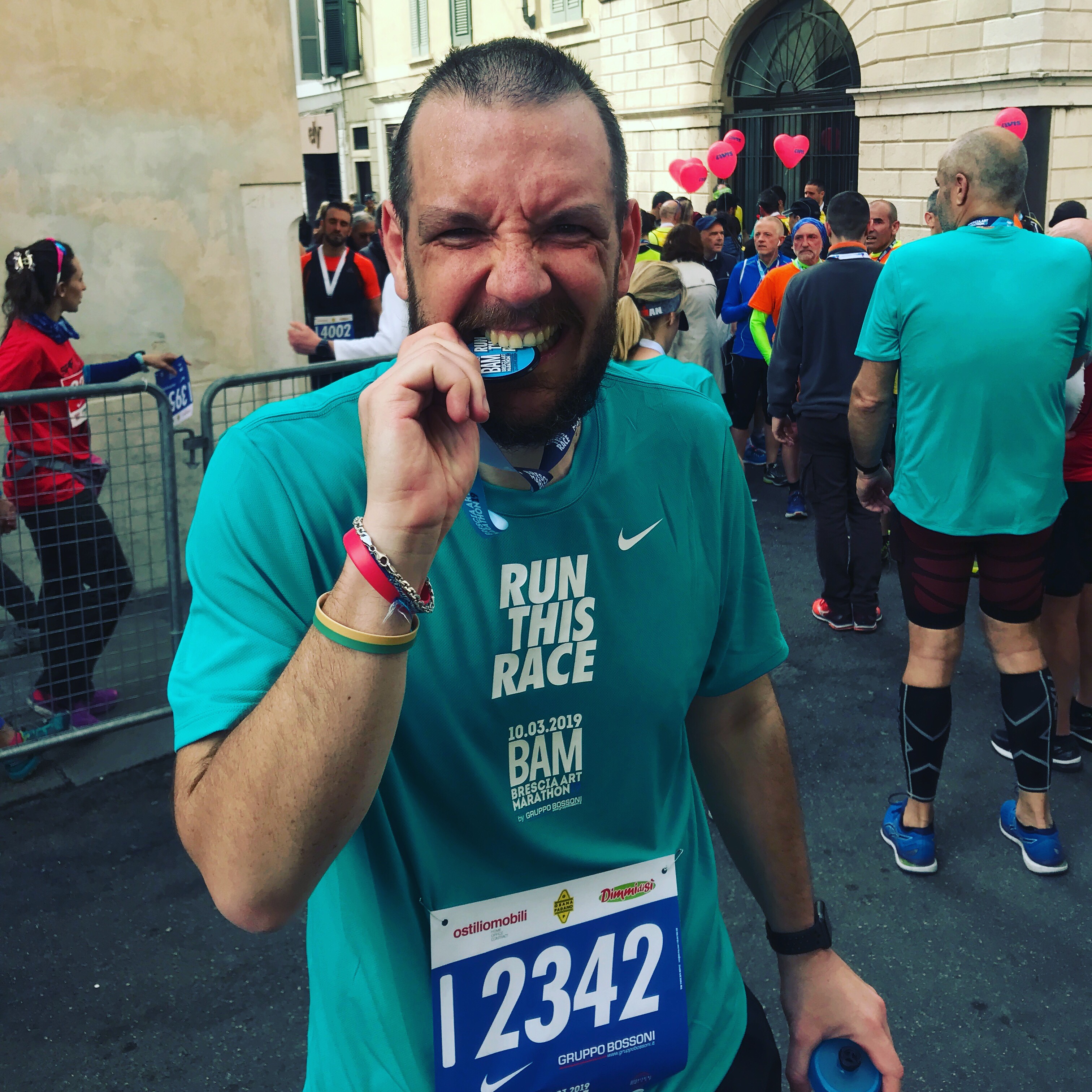 Sento intensificarsi il rumore della folla, Piazza della Loggia è ormai oltre questo arco sotto al quale passo correndo con tutta l’energia che mi rimane in corpo. Il traguardo è a 500 metri, le lacrime salgono ma le ricaccio giù. Mi viene da piangere, ma non voglio farlo. Singhiozzo, cercando di non perdere il ritmo. Ed eccomi, l’ultimo rettilineo, allungo per accorciare il tempo necessario a passare la linea di arrivo. Ad accogliermi una ragazza che mi porge la medaglia. Un ricordo che custodirò per sempre come il più prezioso dei tesori. Abbraccio Ste, è lui che mi ha portato fino a qui.