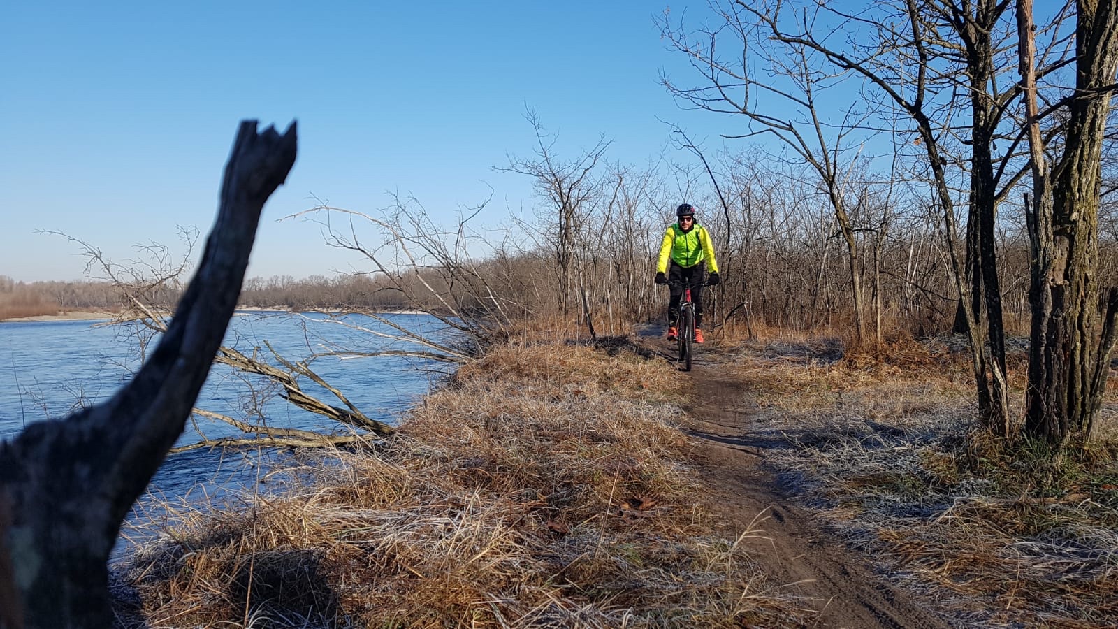 Il giro parte da casa, con un freddo a dir poco pungente. Un freddo che ti entra dentro. Ma la strada sterrata, i colori della campagna in inverno, le pozzanghere ghiacciate sulle quali scheggiare rendono tutto meno congelato e scaldano il cuore. Attraverso la campagna si giunge sulla sponda del Ticino, e lì ad attenderci il bosco coi suoi sentieri, i suoi saliscendi, i sui ghirigori. Il freddo mano a mano si mitiga, anche grazie alla bellezza del panorama. Il fiume scorre veloce, tra ponti e cascate.